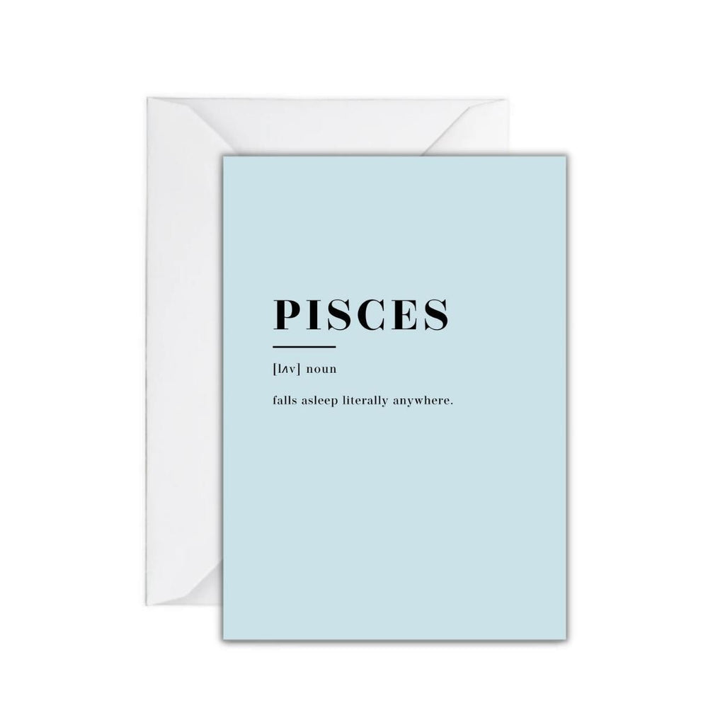 Die Grußkarte „PISCES“ mit dem Spruch „falls asleep literally anywhere." verleiht Deinem Geschenk einen ganz persönlichen Touch und sorgt garantiert für einen Schmunzler.