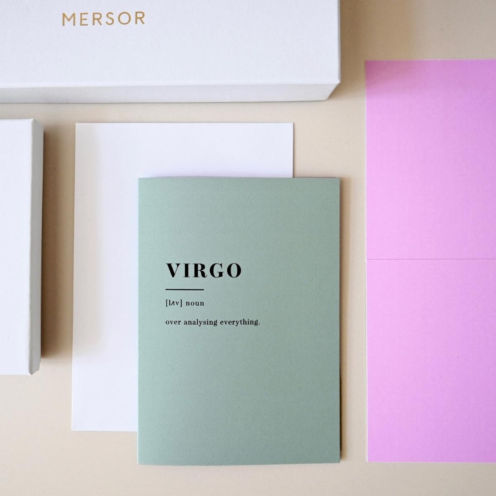 Die perfekte Grußkarte für das Sternzeichen Jungfrau in einem zartem Pastellgrün mit passendem Briefumschlag. Hinterlasse einen bleibenden Eindruck und verschenke jetzt mit MERSOR!