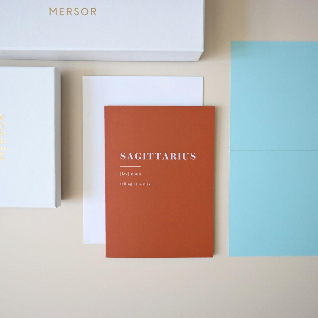 Die perfekte Grußkarte für das Sternzeichen Schütze in einem edlen Rostbraun mit passendem Briefumschlag. Hinterlasse einen bleibenden Eindruck und verschenke jetzt mit MERSOR!