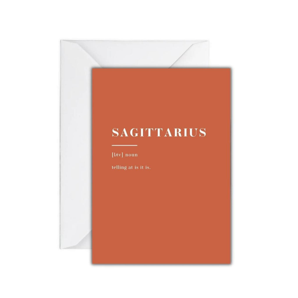 Die Grußkarte „SAGITTARIUS“ mit dem Spruch „telling at is it is." verleiht Deinem Geschenk einen ganz persönlichen Touch und sorgt garantiert für einen Schmunzler.
