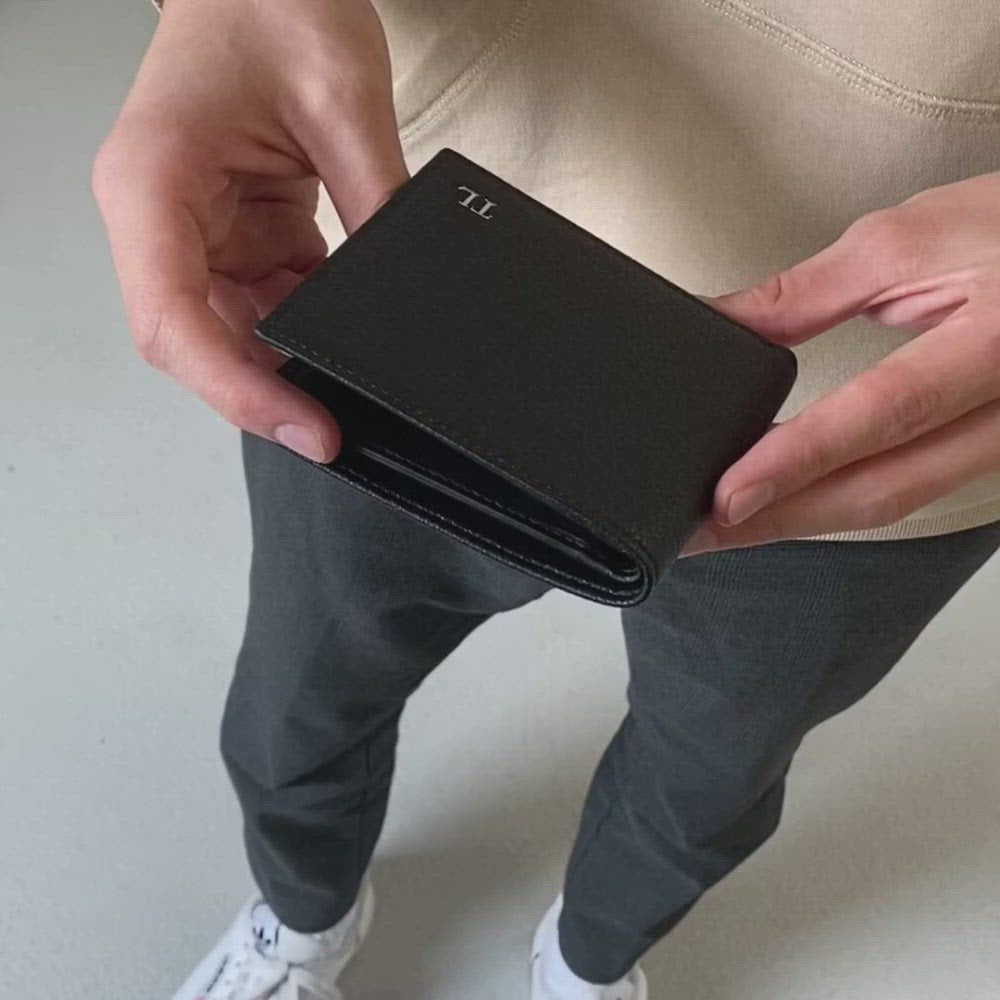 Personalisierte Geldbörse aus schwarzem, genarbten Leder.