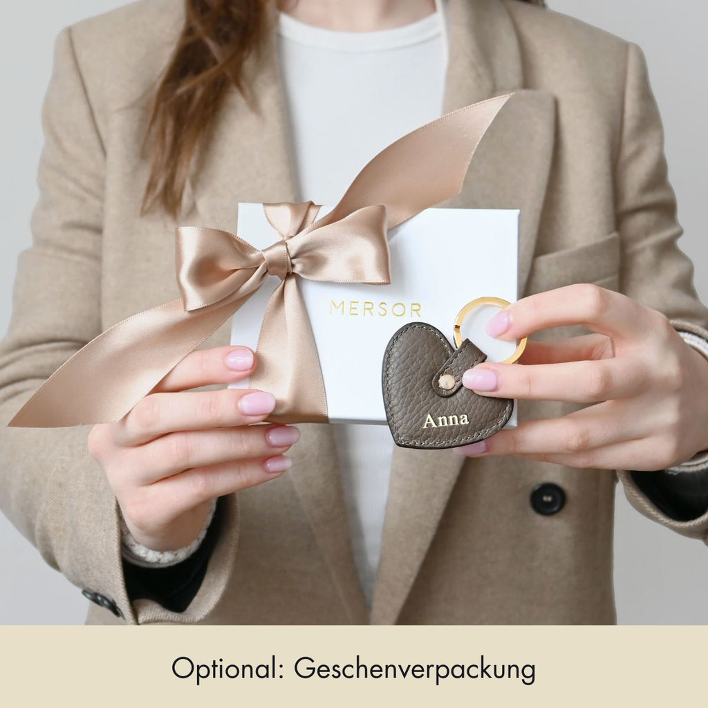 Der Herz Schlüsselanhänger aus italienischem Premiumleder ist das perfekte Geschenk für eine besondere Frau in Deinem Leben! – egal zu welchem Anlass! Jetzt kostenlos mit Deiner Wunschpersonalisierung veredeln und mit MERSOR verschenken!