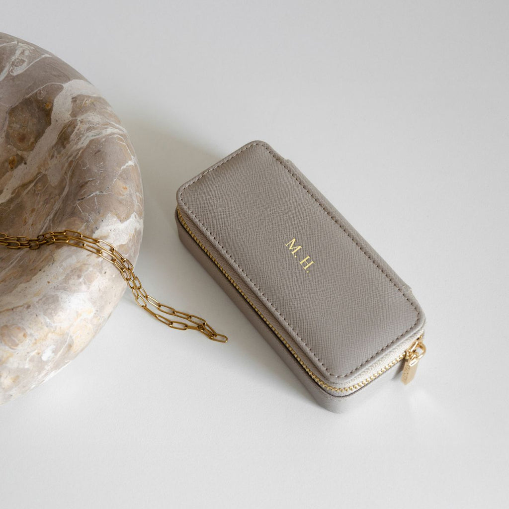 Personalisierbare Schmuckschatulle für unterwegs in Taupe – ideal für Reisen.